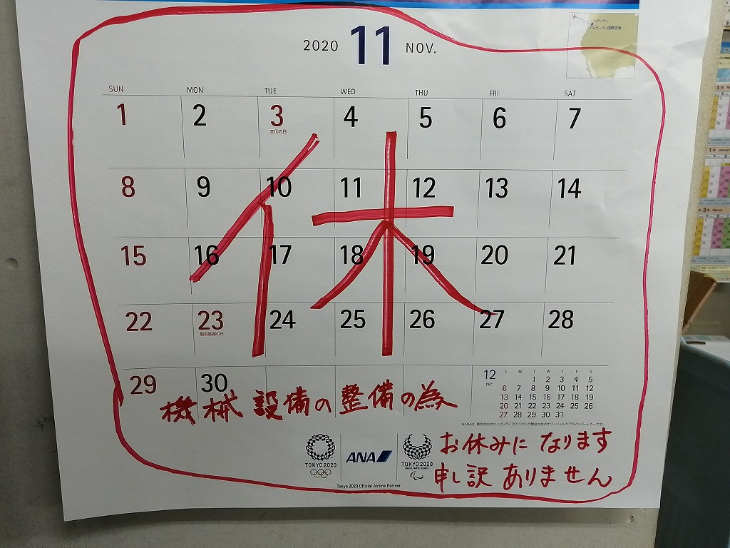 教室の機械設備の整備に伴う、お休みのおしらせ